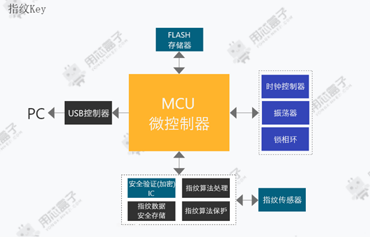 指纹Key是以主控MCU为核心,存储器存放指纹数字模板及认证信息等。