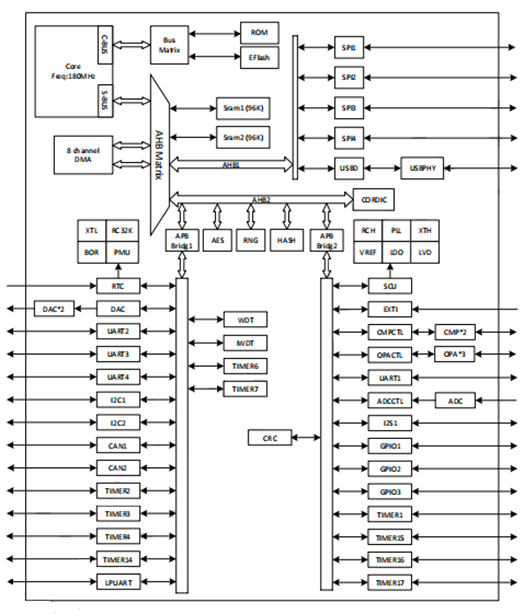 芯片采用32位内核,片内集成多种安全密码模块,以及RSA/ECC、ECDSA、DES/3DES、AES128/192/256、SHA1/256/384/512等安全算法。芯片提供了多种外围接口,这也使得其适用于多种场景。
