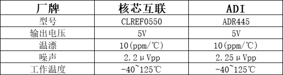 核芯互联的CLREF0550与ADI的ADR445BRZ-REEL7作为表贴基准源,它们的输出电压、温漂、工作温度等应用数值相同,它们之间的噪声也相近。因此核芯互联的CLREF0550作为一款CMOS电压基准源,可以做到ADI的ADR445BRZ-REEL7功能替代。
